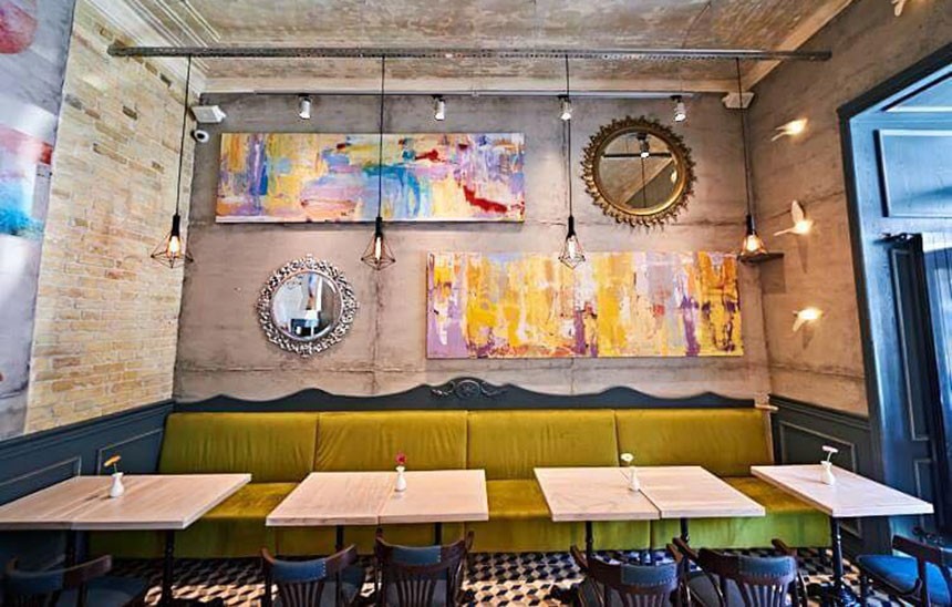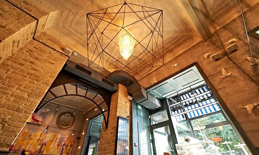 Інтер'єр ресторану виконаний в світлих тонах, що надає обстановці легкості.