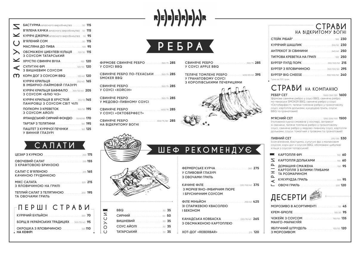 Фірмове блюдо закладу - це ребра. Їх в меню кілька позицій - на будь-який смак. І вибір страв може задовольнити не тільки любителів такої поживної їжі. З напоїв акцент в REBERBAR зроблений на пиві.