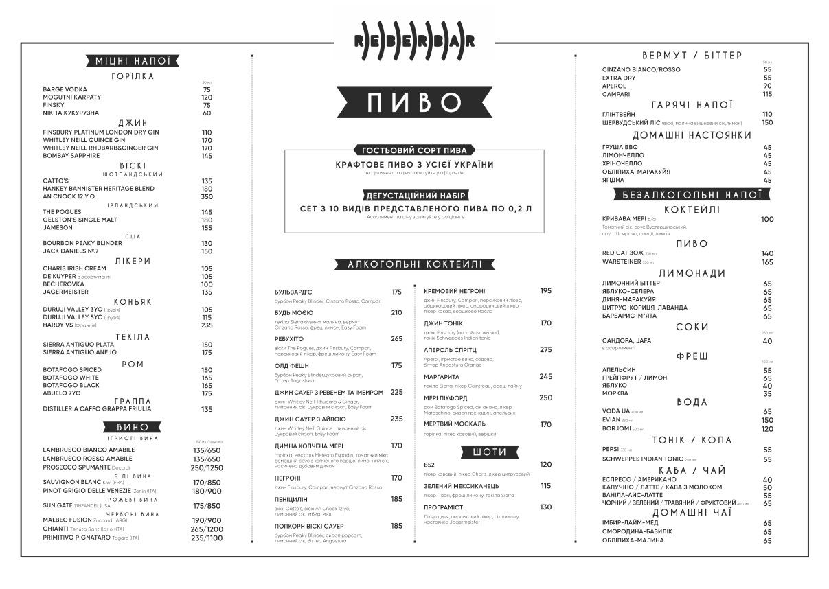 REBERBAR - це фірмові соковиті ребра й крафтове пиво з власної броварні в центрі Києва. Знавці й фанати своїх справ об'єднали зусилля, щоб створити культове місце для всіх поціновувачів пива та смачної їжі.
