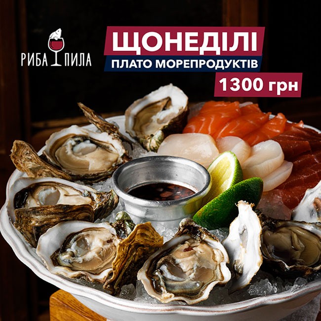 Обирайте плато морепродуктів у ресторані "Риба Пила" та зробіть ваші вихідні особливо смачними. Щонеділі ресторан подає 6 устриць Чорна перлина, сашимі з лосося, тунця та гребінця всього лише за 1300 грн.