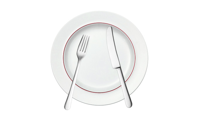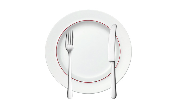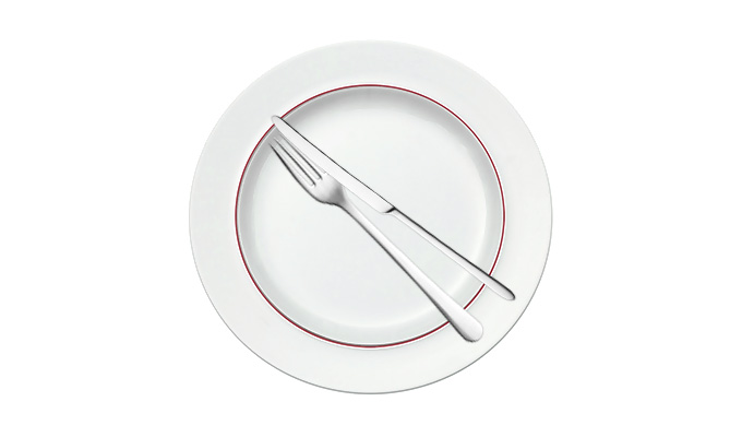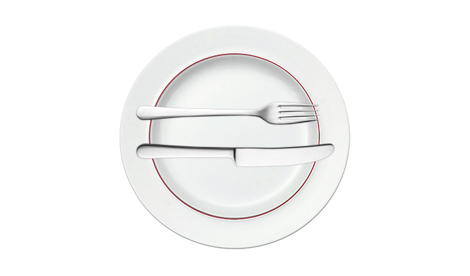 1. За умови достатку смакоти у вашій тарілці, можна використовувати лише вільне місце по обідку. Виходячи з цього, ставимо столові прибори, лезом торкаючись краю тарілки, ручками торкаючись поверхні столу. Ніж справа, виделка зліва.