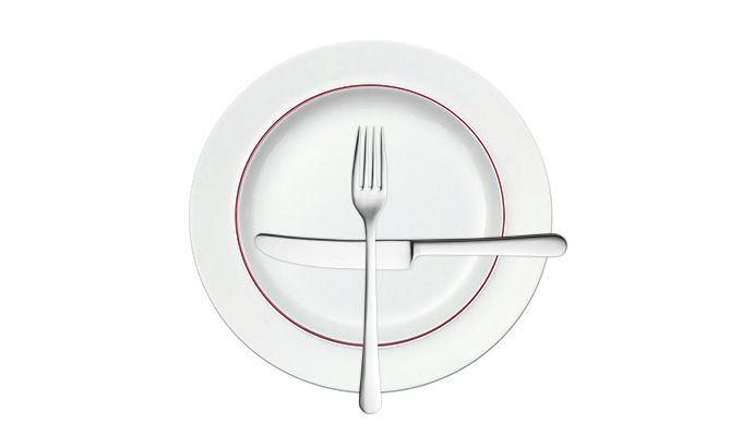 Якщо ви поспішаєте, є варіант показати персоналу, что сегодня обслуговування буде швидка, подача страв и збір посуд оперативно. Складіть вилку з ножем хрест на хрест, вістрям ножа вліво, зубці виделки повинні дивитися вгору.