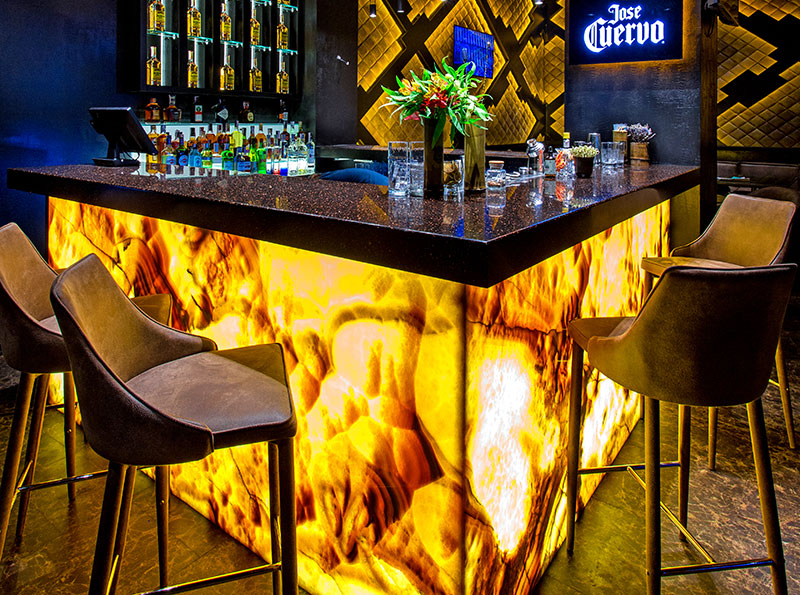 На окрему увагу заслуговує вокал-бар і його шумопоглинаюча стіна у вигляді шкіряних ромбів з імітацією під пітона. Як і барна стійка з суцільного шматка онікса, виглядає неймовірно!