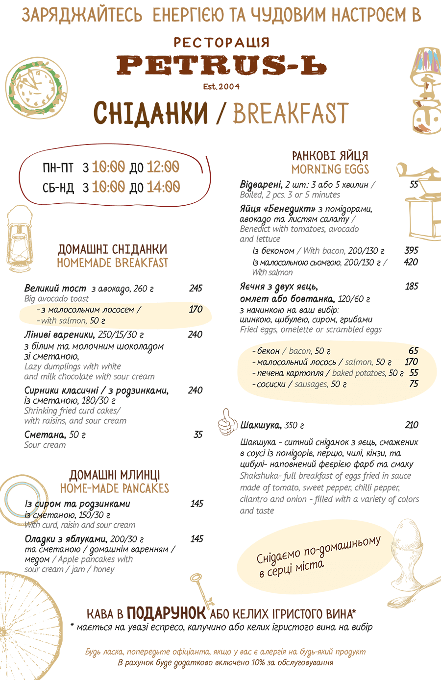Ресторан-вареничная Petrus-Ь – один из самых известных ресторанов Киева, место с 15-летней историей. Основной акцент меню сделан на самобытной украинской кухне: вареники, голубцы, деруны, галушки, борщ и пампушки, домашняя колбаска, сало, закарпатские грибочки и прочие украинские специалитеты. Гастрономическая классика в меню представлена стейками, медальонами, разнообразием блюд из мяса и рыбы, салатами, десертами.