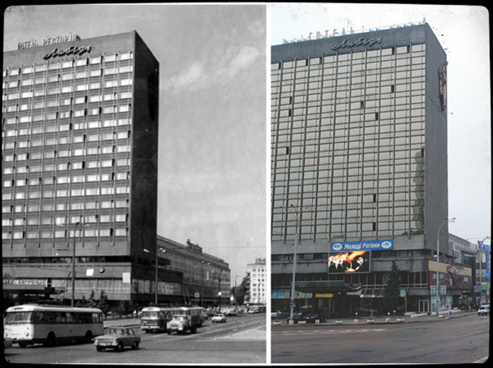 Площадь Победы в Киеве насчитывает всего три адреса – цирк, универмаг «Украина» и гостиница «Лыбедь» (архитектурная доминанта площади высотой̆ почти 55 метров).