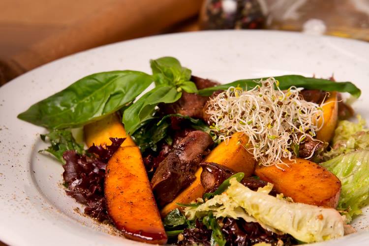 Учитывая тот факт, что любая птица любит ягодное дополнение, то клюквенный соус на основе красного вина, клюквы, сахара и сливочного масла идеально дополняет данное блюдо. Сама утка была замаринована таким образом, что вкус ее не был утерян, а наоборот, идеально подчеркнут в этом салате. Вторым компонентом является карамелизированный персик, который прибавляет сладости к утке с клюквенным соусом. В дополнение ко всему этому, листья салата, сбрызнутые лимонным соком и маслом, подчеркивают легкость данного блюда.