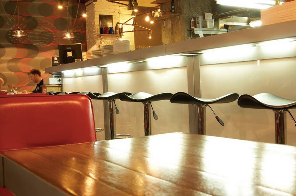 Уютное помещение, приятная атмосфера, богатое меню и внимательный персонал — это то, что ожидает Вас, если Вы посетите данное заведение. В ресторане вы найдете большой светлый зал с баром (вместительностью 50 человек), а также летнюю террасу на 40 мест. Интерьер заведения сделан в стиле Loft: современные материалы соединены с грубой фактурой. На потолках – оригинальные люстры: гибкие металлические шланги с цоколем, куда вкручены матовые лампы, а также люстры-пауки, сделанные из медных водопроводных труб.