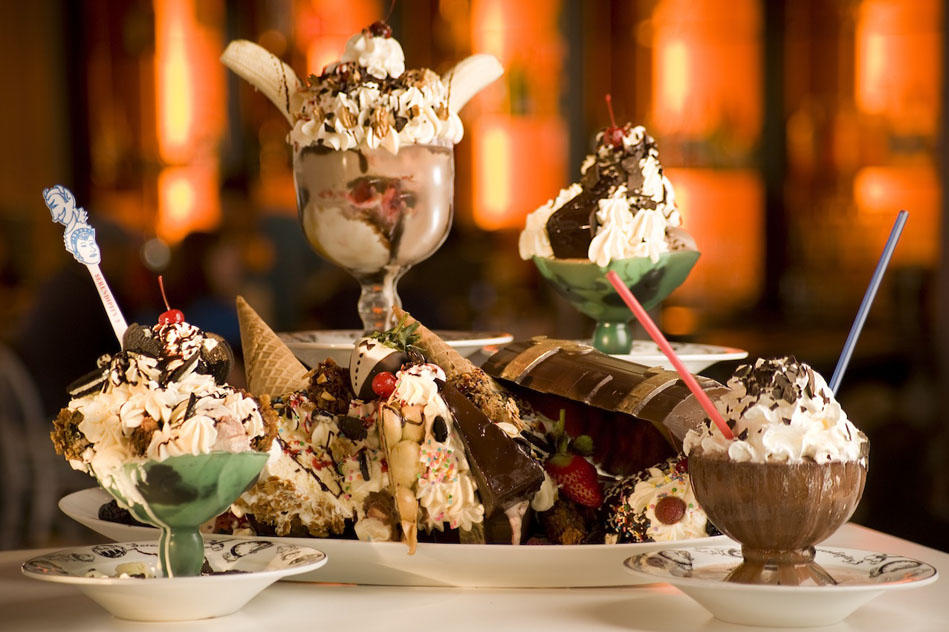 В нью-йоркском ресторане "Serendipity 3" можно попробовать сливочное мороженое на 25 сортах какао, с кусочками съедобного золота в бокале с золотой каймой и алмазами в сопровождении золотой десертной ложки инкрустированной алмазами. Цена на десерт составляет 25 тысяч долларов (посуду можно забрать домой).