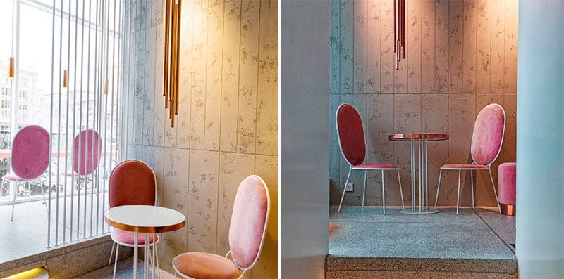 Сама кофейня оформлена в нежных пастельных тонах – от пудрового и бежевого до нежно-розового. При этом яркости Bo. Pastry добавляют вкрапления ламп и витрин золотистого цвета.
