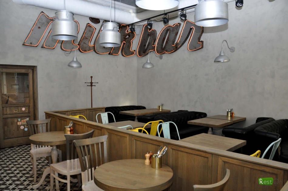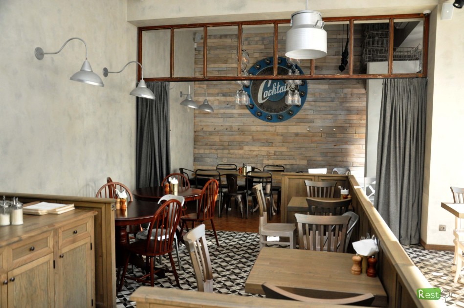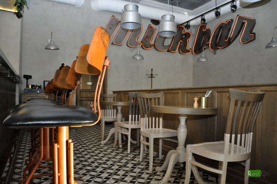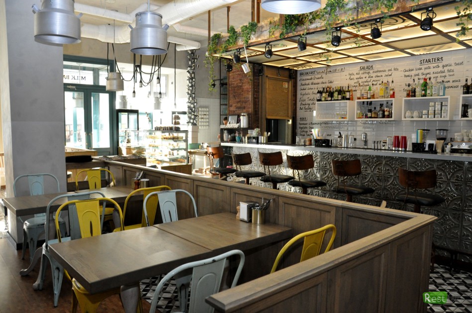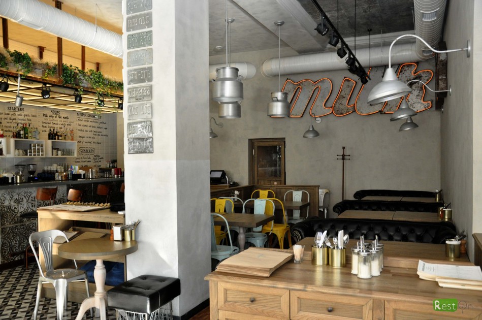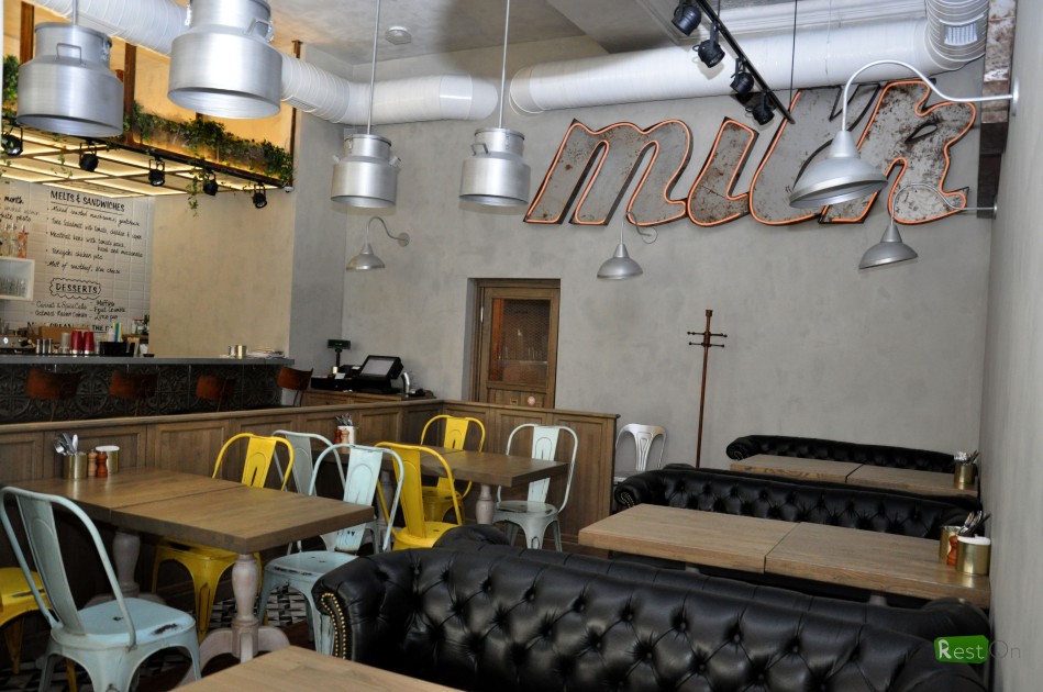 Высокие потолки, бетонные стены, винтажные диваны в черной коже, металлически трубы, панорамные окна — все это вылилось в такой комфортабельный и приятный интерьер. Немаловажными также остаются продуманные дополнения: горшки с цветами, бидоны вместо люстр, старинные стеклянные баночки из-под молока, деревянные перегородки между столиками и другие удивительные предметы. «Milk bar» условно разделен на три зоны: основной зал, небольшая комната для большой компании и, конечно же, бар, облицованный плиткой, на которой расписано меню заведения.