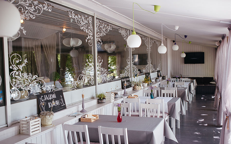 Ресторан имеет три зоны. В отличие от большинства заведений главной зоной отдыха является летняя терраса: деревянная площадка с комфортными деревянными лавочками в "деревенском" стиле выкрашена белой краской, перетянута канатами и увешана воздушными тканями аметистовых оттенков.