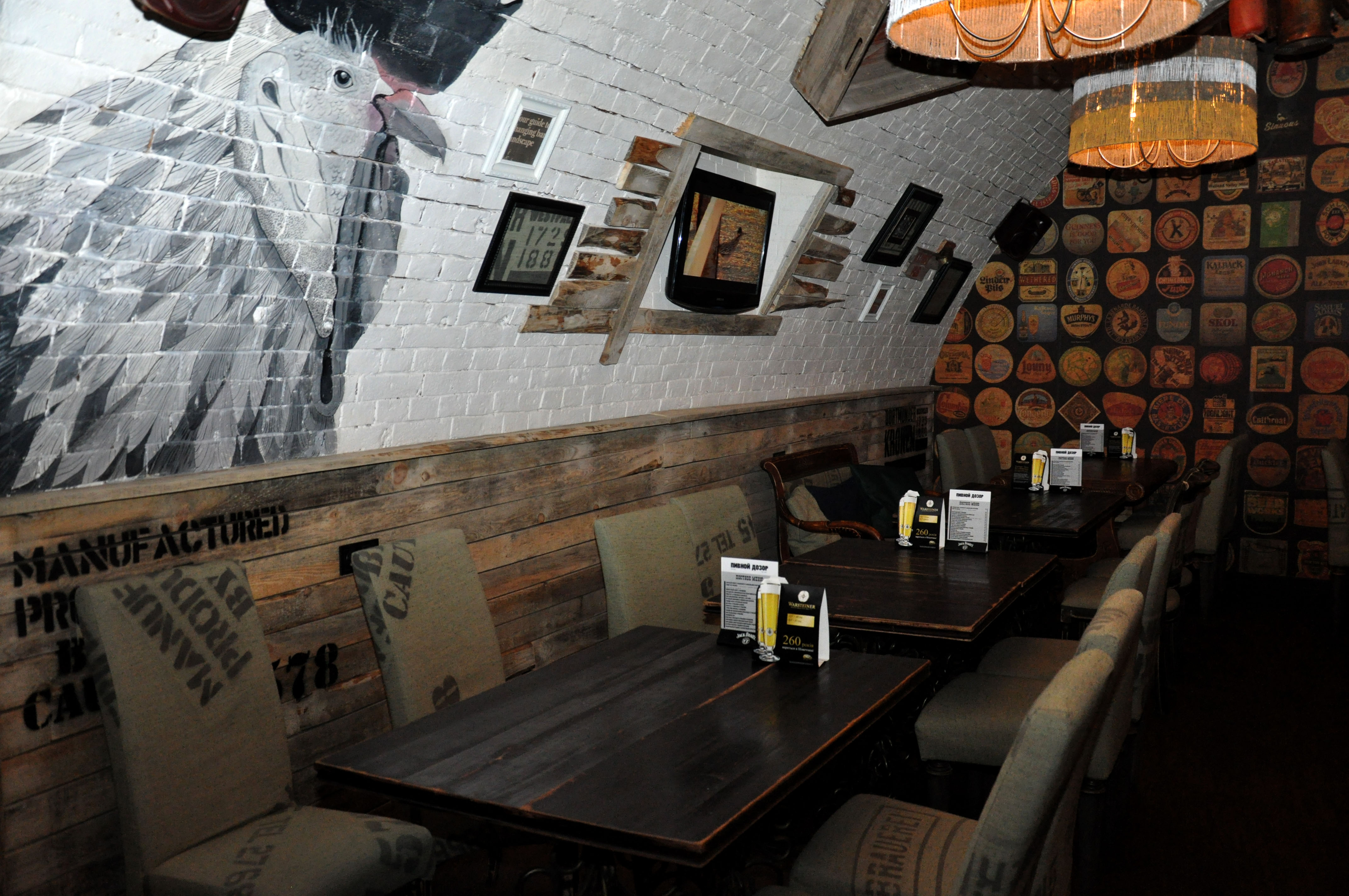 Обстановка «Пивного дозора» вызывает некие ассоциации с Новой Англией, портами и складами. Беленые стены, «состаренные» столы, удобные мягкие стулья, обитые тканью, напоминающей мешковину. На стенах — большие стильные росписи и принтовая авторская инсталляция, вазоны с зелеными растениями «для выработки кислорода», а под потолком — «лестница» — люстра. В общем, ничего лишнего – все строго, лаконично, стильно и просторно.