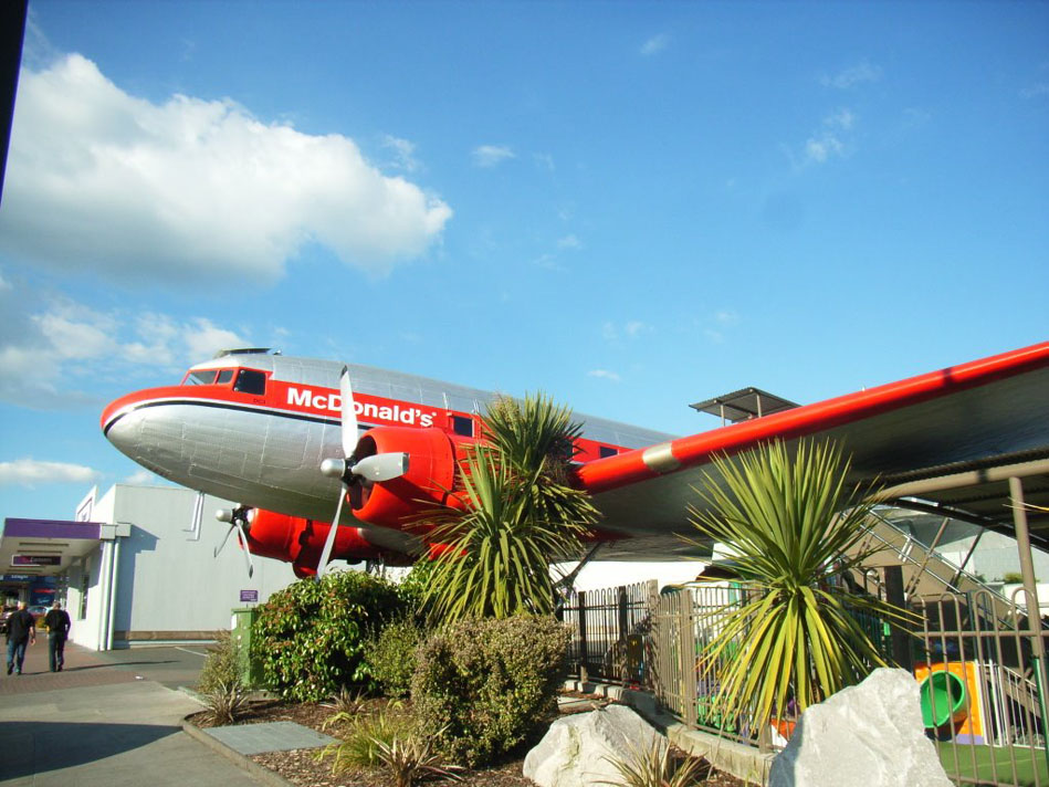 Интересной историей возникновения может похвастаться McDonald's в новозеландском городе Таупо. Создатели этого ресторана облюбовали под заведение корпус старого самолета. В итоге кресла летательной машины были переделаны в столы и стулья для посетителей, а кабина пилота и вовсе осталась нетронутой, превратившись в местный экспонат.