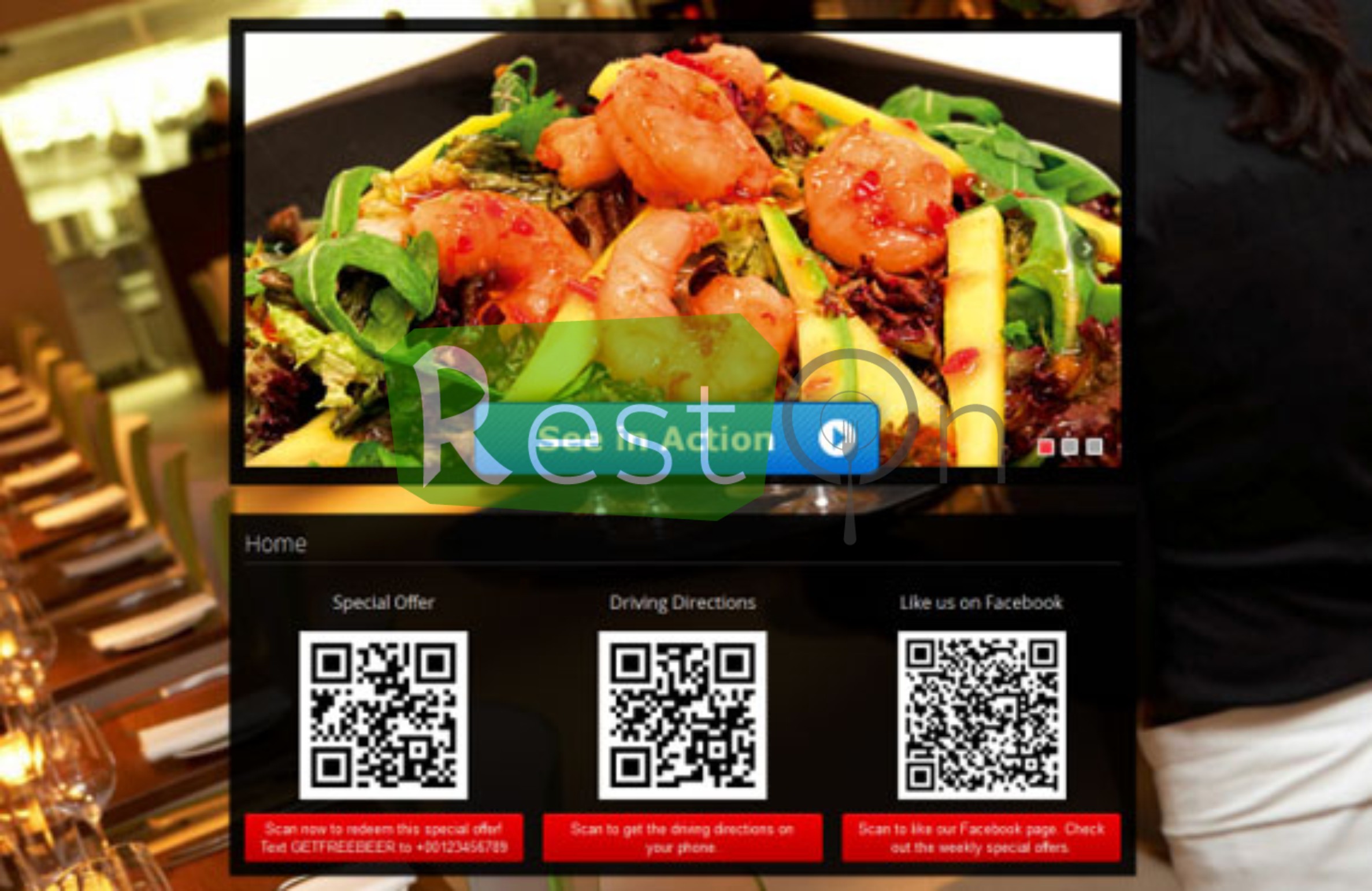 Завдяки розміщеної в QR-коді інформації про час роботи закладу і контактів, обов'язково збільшиться кількість замовлень в офіси і додому. З його допомогою заклад може оповіщати своїх клієнтів про акції, лотереї, розіграші, активізувати всілякі програми лояльності, влаштовувати голосування, інтерактивні опитування і швидко отримувати відгуки про ресторан від клієнтів. Відвідувач, відсканувавши QR-код ресторану і внісши в календар свого телефону інформацію про зацікавив подію або призначену зустріч, вже ніколи про них не забуде.